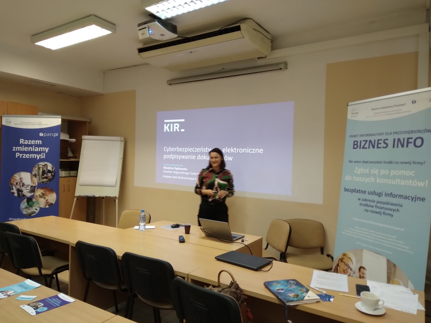 Ostatnim omawianym zagadnieniem był podpis elektroniczny. Prezentację pt.: „Cyberbezpieczeństwo a elektroniczne podpisywanie dokumentów”, omówiła Pani Wioletta Piątkowska, Dyrektor Regionalnego Centrum Sprzedaży w Rzeszowie, Krajowa Izba Rozliczeniowa S.A.